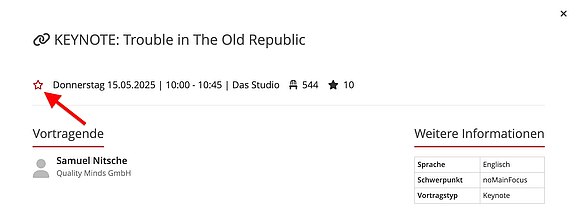 Im Programm findest du bei jedem Vortrag die Möglichkeit, über das ⭐️ Stern-Symbol ⭐️ deine Favoritenauswahl zu tätigen.