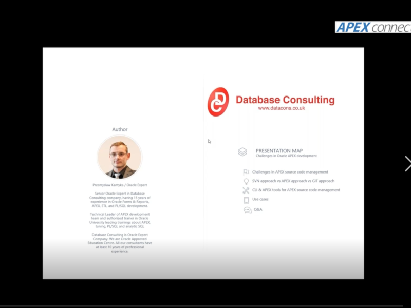 APEX Source Code Management und Release Lifecycle sind komplexe Themen – insbesondere wenn das Ziel lautet, die Arbeit des Entwicklungsteams zu optimieren und Entwicklungspausen und Freeze-Perioden zu reduzieren. In seiner Session beschreibt Przemyslaw Kantyka von Database Consulting die besonderen Herausforderungen bei der APEX-Entwicklung und liefert Best Practices für das Source Code Management.