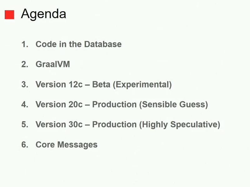 Er vergleicht sie mit PL/SQL und Java und spricht außerdem darüber, was er für die Versionen 20 und 30 erwartet und warum MLE "the next big thing" ist.
